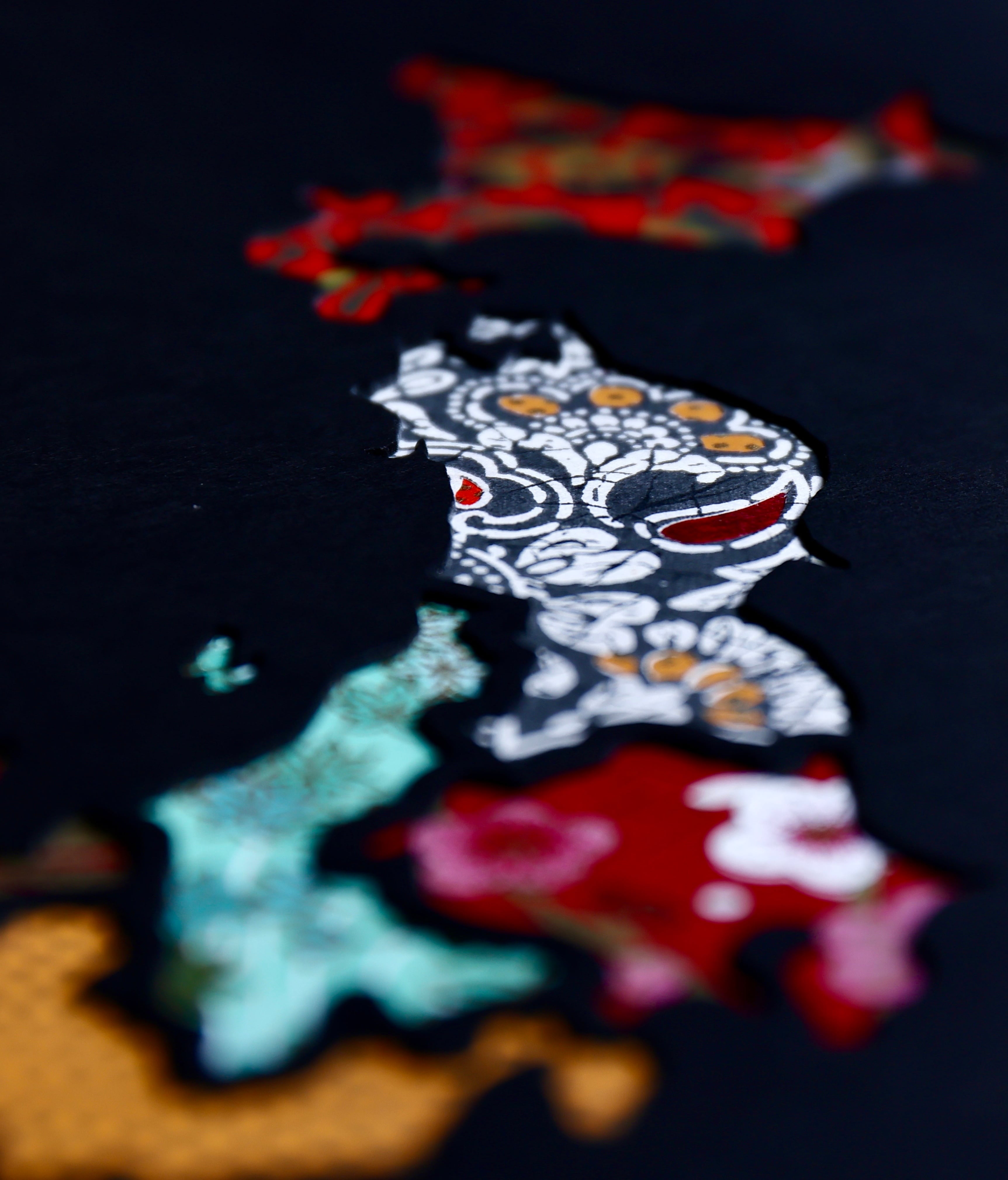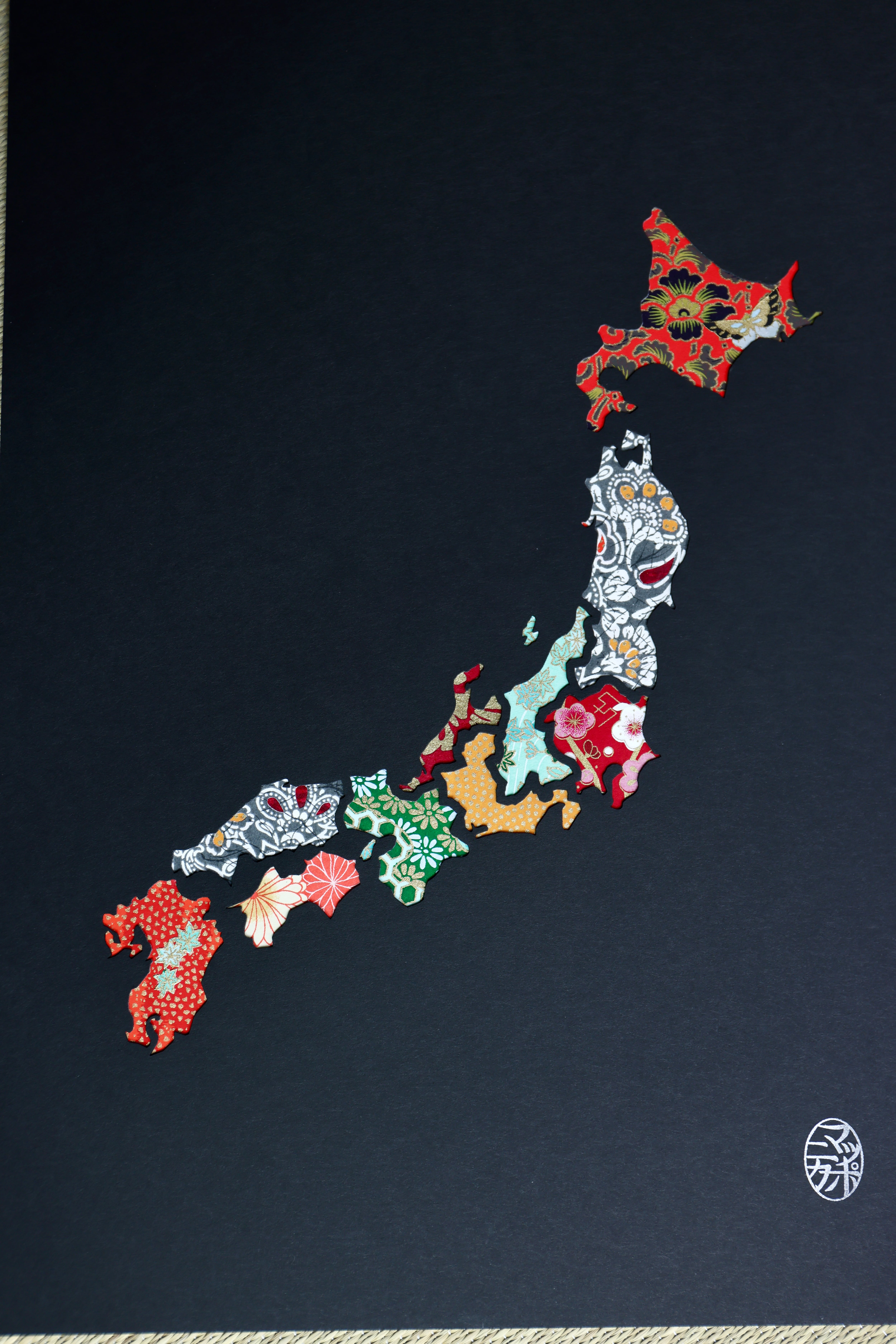 Map of Japan with 10 regions decorated with 10 different types of Japanese traditional papers, including appliques.