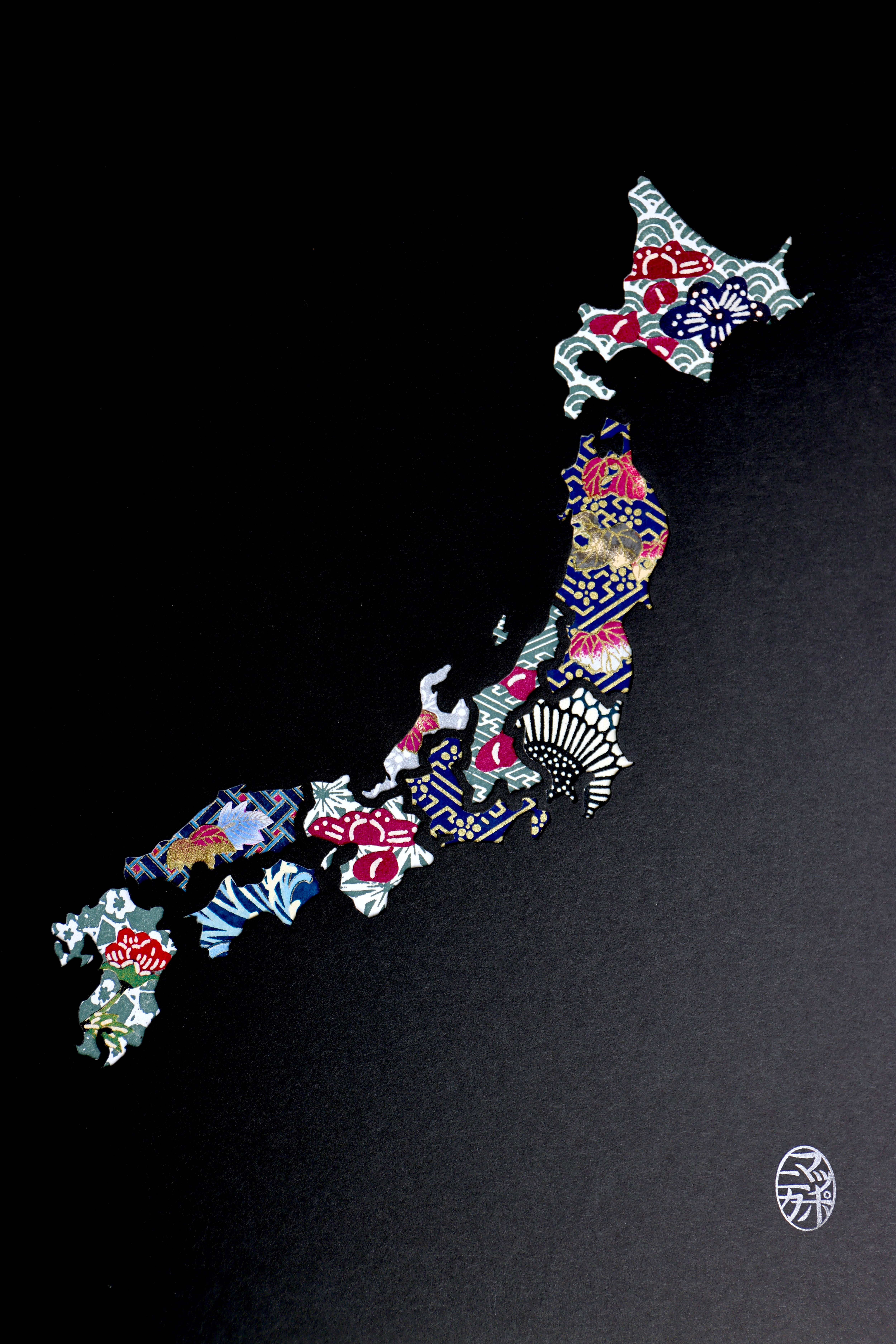 Map of Japan with 10 regions decorated with 8 different types of Japanese traditional papers, including appliques .