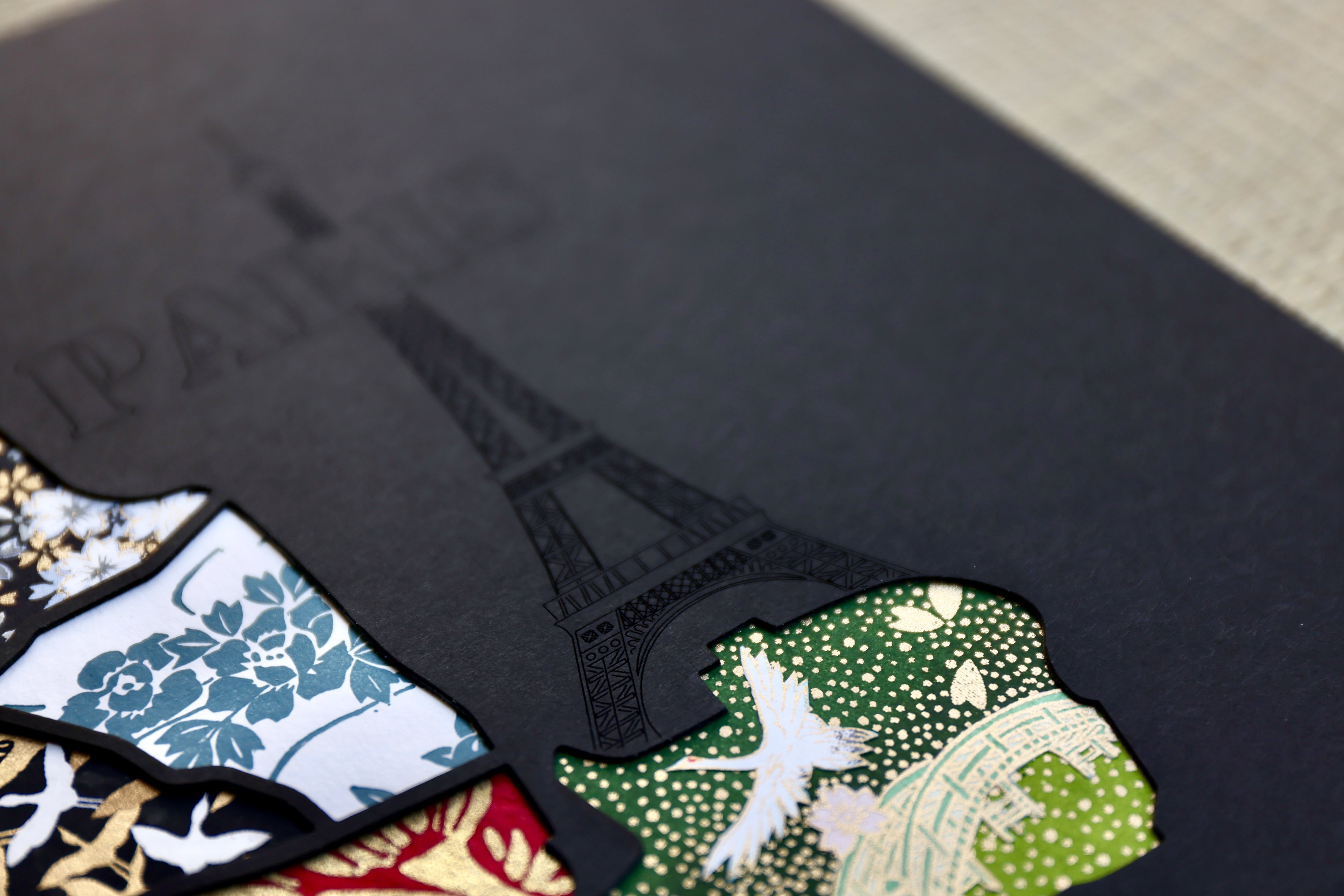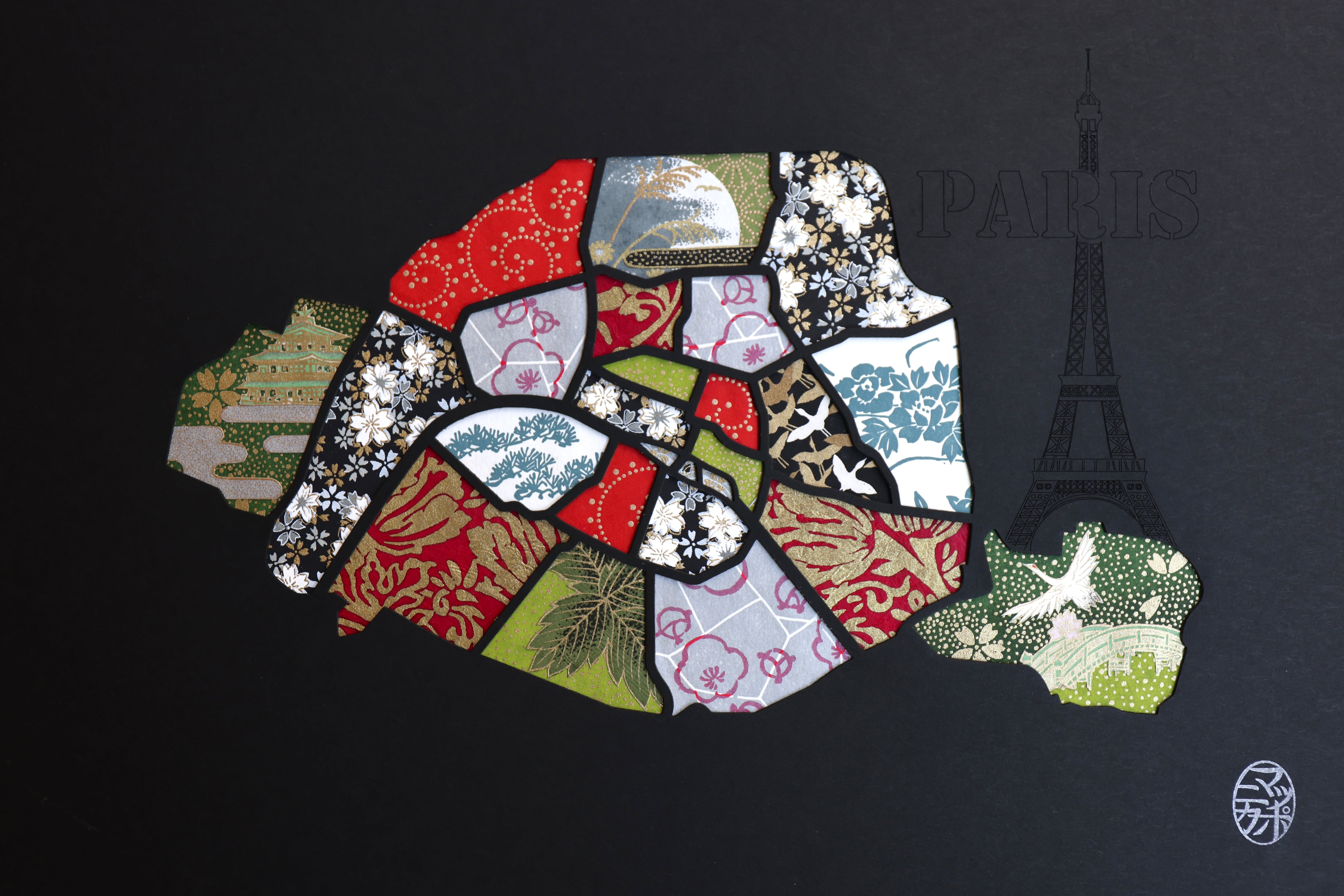 Map of Paris, Reds, Greens, Gold and Greys, inspired from the dominant colours in Japanese shrines and temples.
