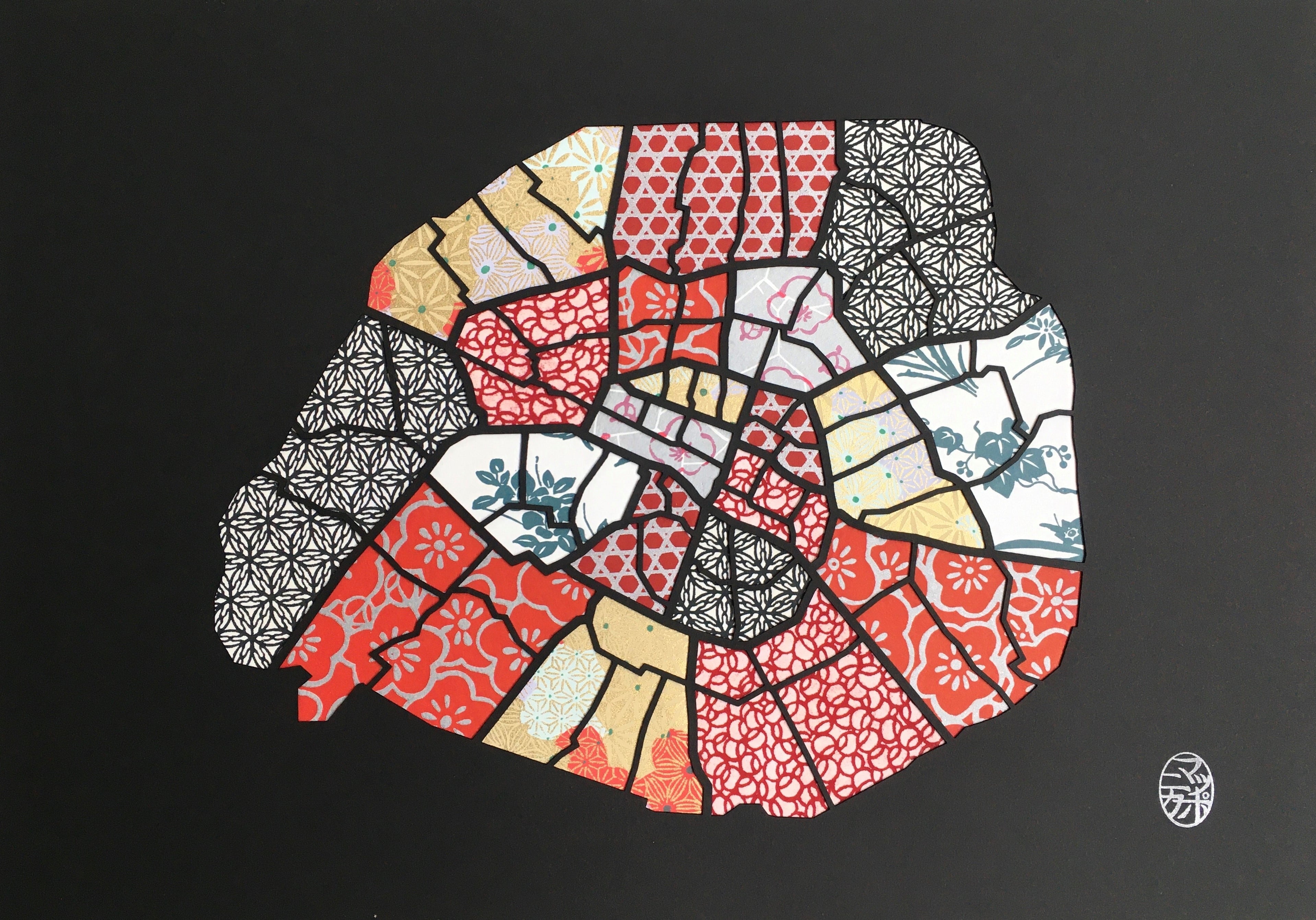Map of the PARIS decorated with 7 different types of Japanese traditional papers. Paris